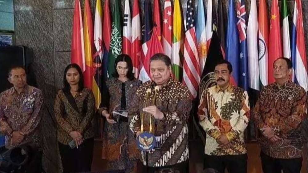 Menteri Koordinator Bidang Perekonomian, Airlangga Hartarto bersama sejumlah menteri menyampaikan laporan capaian serta target sektor pariwisata 2026 di Kementerian Pariwisata Jakarta, Senin (12/1/2026). (Foto: Kemenko Perekonomian)