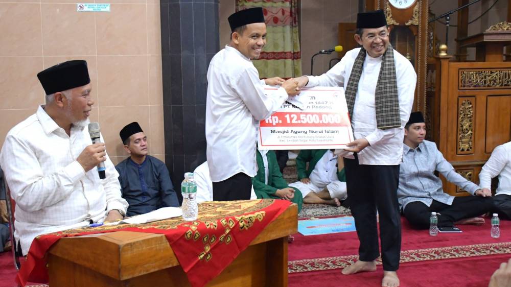 Komisaris Utama PT Semen Padang, Werry Darta Taifur (kanan) memberikan secara simbolis bantuan operasional untuk pengembangan Masjid Agung di Masjid Agung Nurul Islam, Kota Sawahlunto, Sumatra Barat, pada 3 Maret 2026.